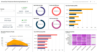 This dashboard showcases the oil and gas KPIs that decision-makers depend on to track both daily operations and trends that occur over longer periods of time.